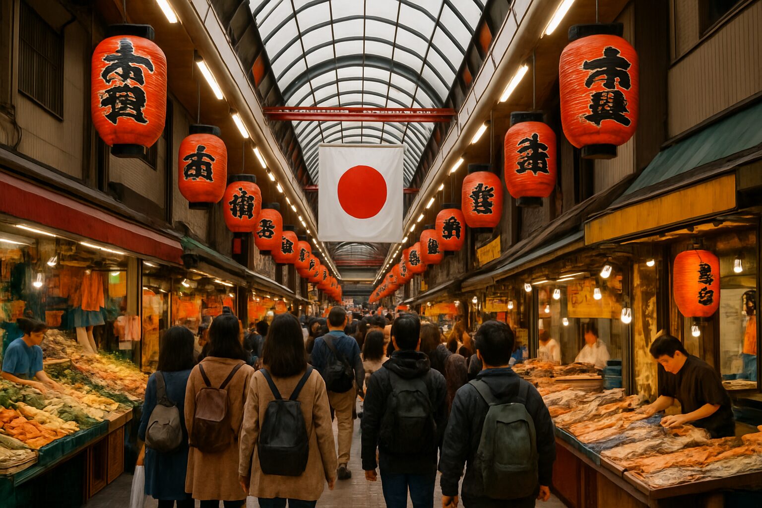 The air is thick with a rich tapestry of aromas telling the story of every shop you encounter. One moment, you’re wrapped in the sweet, savory fragrance of soy sauce and mirin simmering in a shop specializing in nimono (stewed vegetables). A few steps onward, that scent is replaced by the salty, oceanic smell of a fishmonger’s stall, where gleaming silver-skinned fish rest neatly on beds of crushed ice. Then comes the earthy, clean scent of fresh tatami mats from a traditional weaver, followed by the nutty, comforting aroma of freshly roasted green tea from a tea merchant who has occupied the same spot for eighty years. The visual scene is just as vivid. Strings of red paper lanterns sway gently overhead, bold calligraphy on banners announce sales, and hand-written signs, taped to cardboard with endearing imperfection, advertise the price of today’s strawberries. Unlike the uniform fluorescence of a supermarket, the lighting here is varied and alive—a warm yellow glow from an old-fashioned butcher shop, stark white illumination highlighting the tofu maker’s pristine products, and natural sunlight filtering through the arcade’s glass roof, catching dust motes dancing in the air.