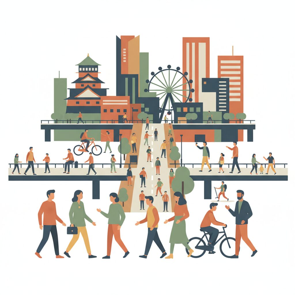Every city has its main streets, but few possess one that encapsulates its entire identity quite like Midosuji Boulevard. This is more than just a road; it is the central artery linking Osaka’s two cores: Kita (North) and Minami (South). Stretching straight for about four kilometers, this grand, tree-lined avenue acts as the city’s physical and psychological anchor. In Tokyo, mental mapping revolves around train lines—the Yamanote, the Chuo, the Marunouchi—with colored lines and station dots defining your sense of place. In Osaka, however, the primary mental map is a simple, elegant line: Kita at the top, Minami at the bottom, with everything else positioned along this axis. This straightforward fact profoundly shapes daily life, making the city’s core not just walkable, but invitingly walkable. On a pleasant Sunday, people stroll the length of Midosuji, observing the seasonal changes in the ginkgo trees and window shopping at the luxury boutiques lining the street. The journey becomes an experience, a gradual transition through shifting urban characters felt block by block. Compare this to traveling from Shibuya to Shinjuku, where the only practical option is to descend underground, board a metal tube, and reemerge in an entirely different world—losing the space in between. In Osaka, that space is the story. This physical connection nurtures a mental one, as Osakans view their city as a single, integrated whole. They are not just ‘Umeda people’ or ‘Namba people’; they are Osaka people who regard both hubs as different rooms within the same house. This unique, unifying geographic feature creates a shared frame of reference rarely found in Tokyo’s sprawling, multi-centered landscape.