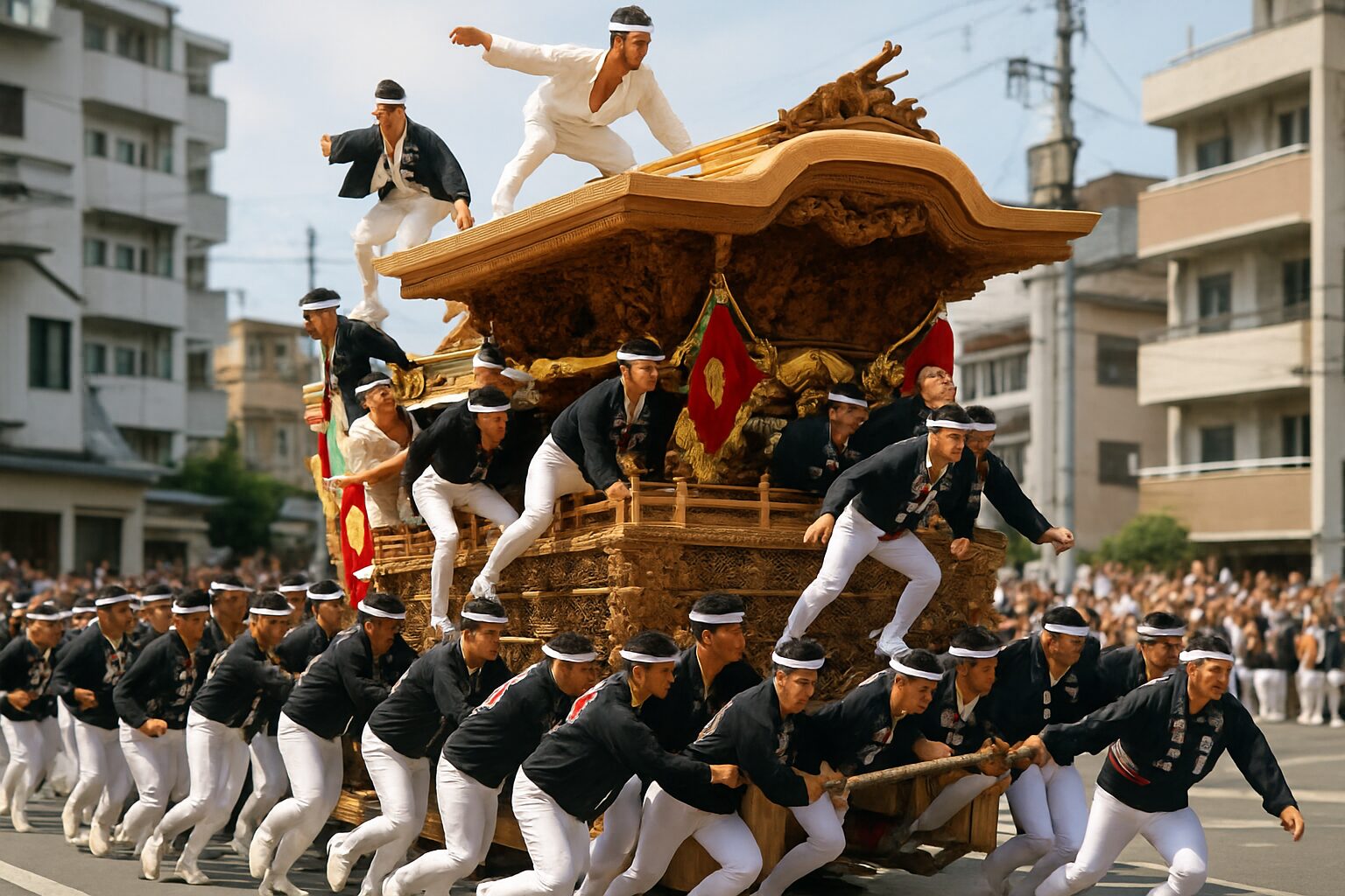 The base of the Danjiri consists of a massive, lattice-like frame constructed from enormous beams of Keyaki wood. These beams are interlocked through a series of incredibly complex joints, each cut with microscopic precision. This forms the skeleton of the structure, designed to endure twisting forces that would break a rigid frame. Rising above is the main body, which includes platforms for musicians playing bells, flutes, and drums, their rhythms serving as the accelerating heartbeat of the procession. The entire structure is topped by a grand, curving roof known as the Ooyane, resembling that of a temple or shrine. It is here, on this precarious, swaying perch, that the festival’s most prominent figure, the Daigunomi or “master carpenter,” stands. His role is to act as a human rudder, directing the pullers below with his fan and gestures, his movements a perfect complement to the float’s violent motion. His presence on the roof is a testament to the Daikugata’s confidence in their craftsmanship; they literally stand by their work as it faces its greatest challenge.