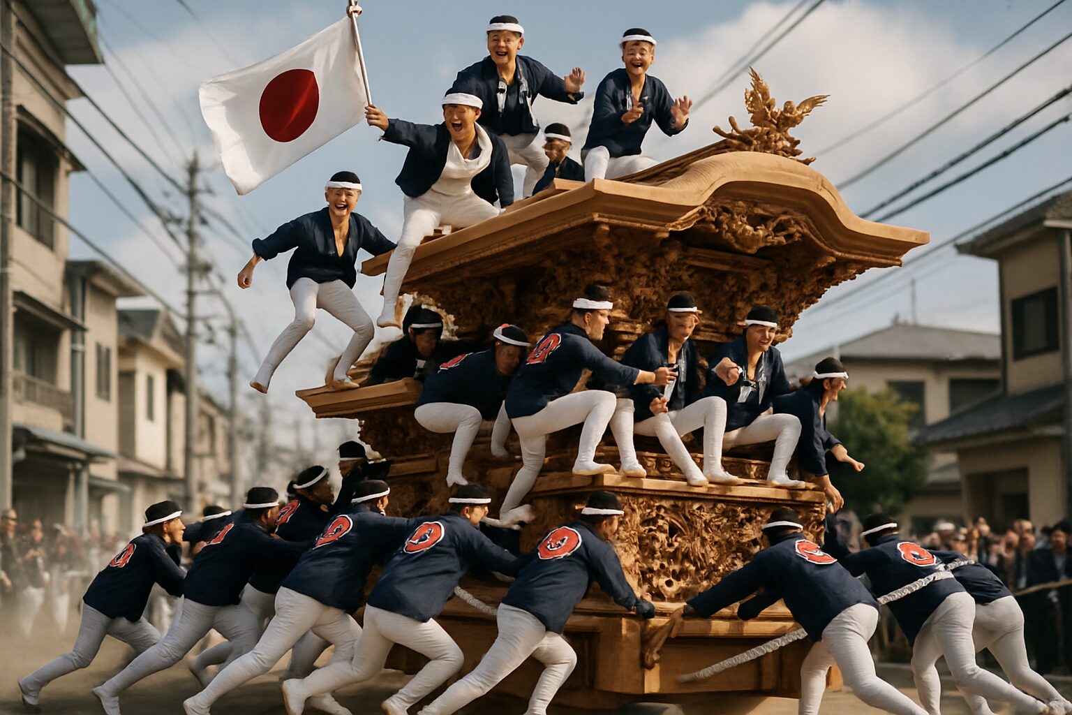 Pulling off a successful ‘yarimawashi’ is a complex interplay of forces. The Danjiri has no brakes and only basic steering, so the turn is achieved through a mix of brute force, leverage, and centrifugal motion. As the float speeds toward the corner, the Daiku-gata on the roof signals the critical moment. On his command, the Mae-teko, the men at the front, thrust their large wooden levers into the ground on the inside of the turn, attempting to pivot the front wheels. At the same time, the Ushiro-teko, the helmsman at the rear, twists his massive lever in the opposite direction, causing the rear wheels to skid outward. The hundreds of pullers on the ropes adjust their speed and angle, with the outside line running wide and fast to pull the float’s front around. For a few terrifying seconds, the Danjiri teeters on a knife’s edge. It leans perilously, the wooden wheels creaking and smoking from friction, threatening to topple or crash into the corner building. The sound is overwhelming: the roar of the crowd, the screech of wood on pavement, the thunder of hundreds of running feet, and the explosive ‘Sorya!’ chant reaching its peak. Then, in a moment of sublime grace, it rights itself, finds its line, and races down the next street—the team having successfully threaded the needle. A perfect ‘yarimawashi’ is a marvel, a fleeting moment where raw power and elegant precision merge as one.